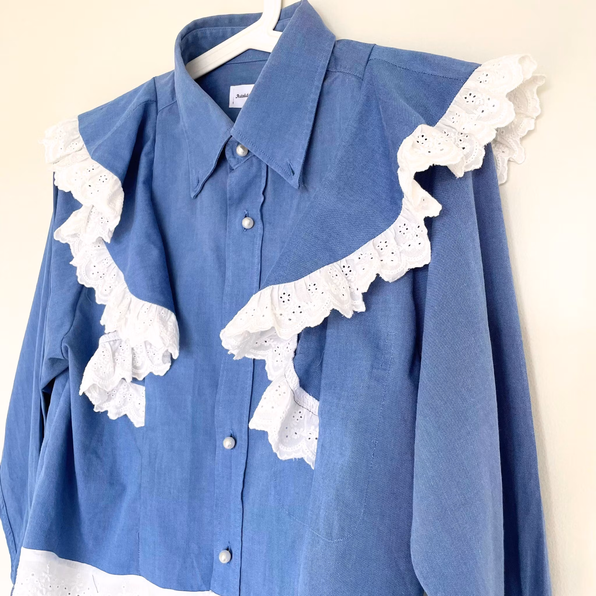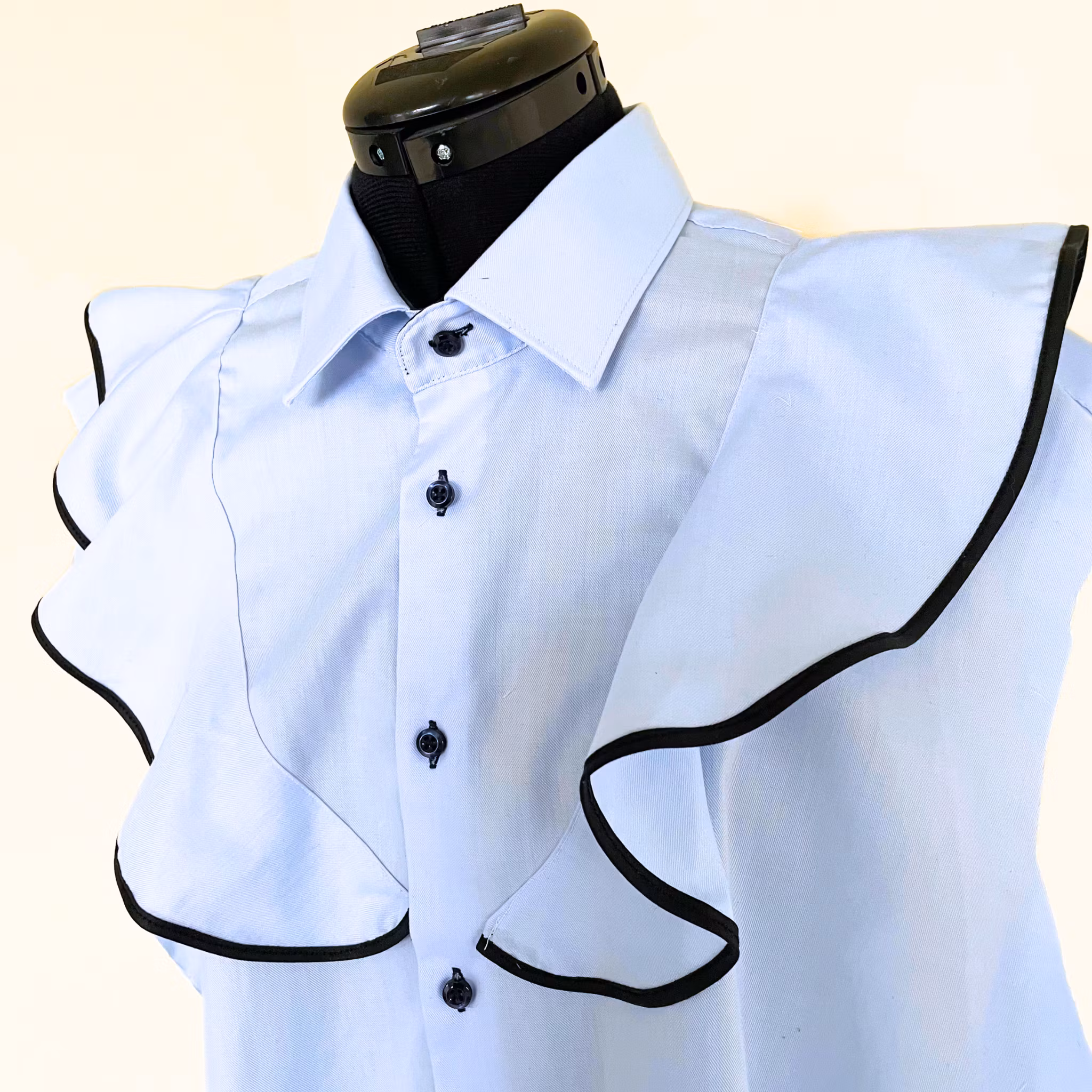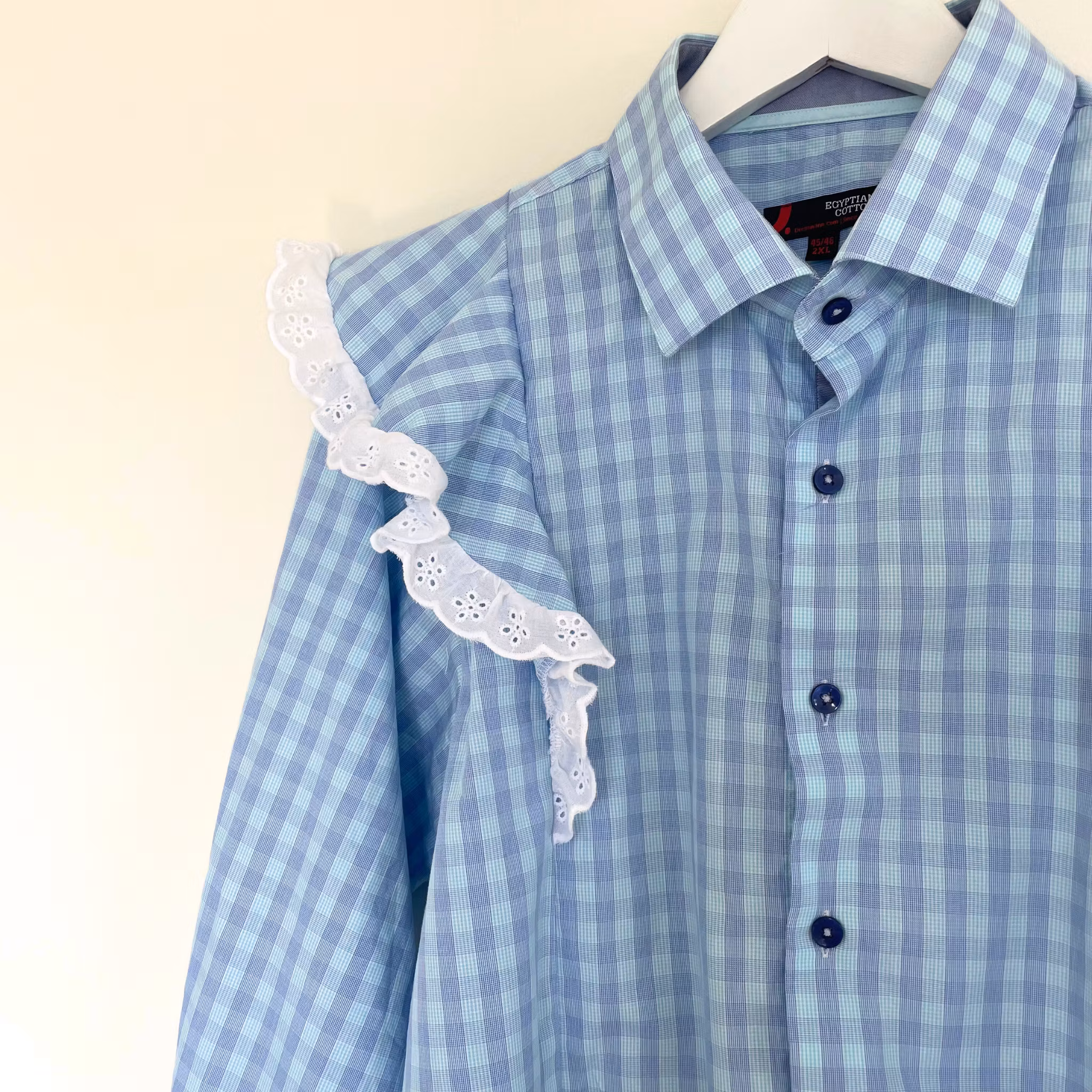 Volang du kan sy på en skjorte, bluse eller kjole for en ekstra design detalj. Nedlastbar PDF-fil på 2 sider. Det er ulike måter å benytte mønsteret på. Du kan sy volangene rett på en skjorte, slik som jeg har gjort på bilde nr 1. av den lyseblå skjorten med sorte kantbånd. Eller du kan montere volangene ved å klippe i skjorten, plassere volangene og deretter sy sammen skjorten igjen. Se reels video som demonstrerer dette på instagram profilen min. Skjorten benyttet i eksempel videoen er den mellomblå skjorten med hvit blonde.