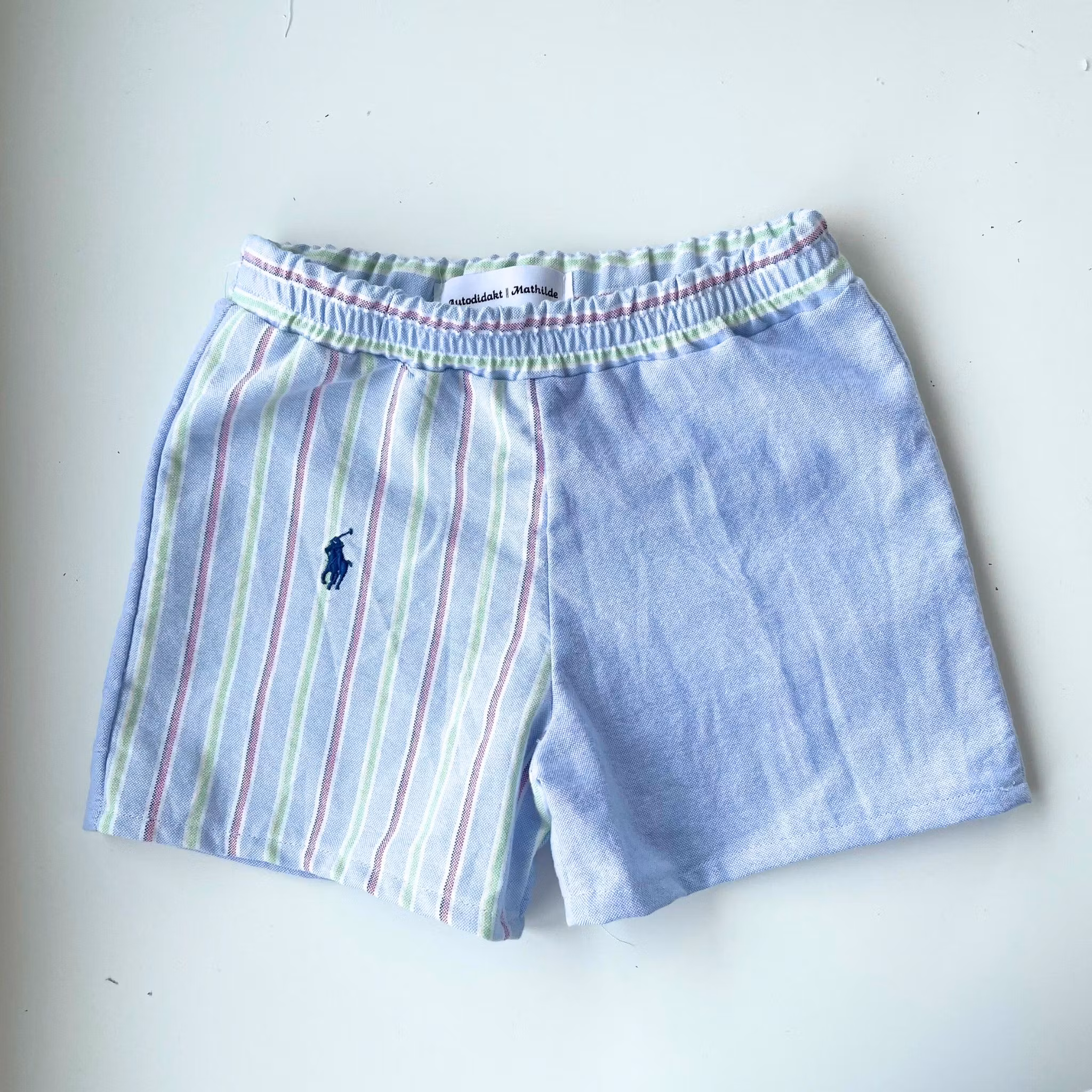 Shorts i 100% oxfordbomull størrelse 98/104Shortsen er sydd opp av tekstil fra 2 stk brukte herreskjorter. Det er ingen bruksmerker på tekstilen som er benyttet
