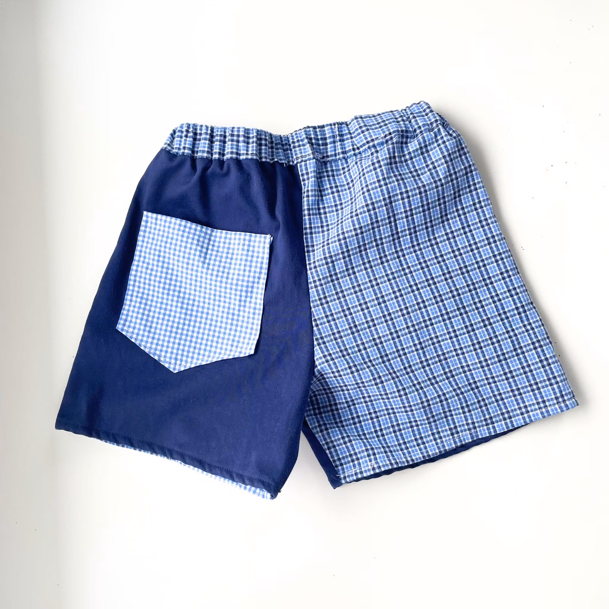 One of a kind patchwork shorts i størrelse 98.Shortsen er laget av tekstil fra secondhand herreskjorter i 100% bomull.